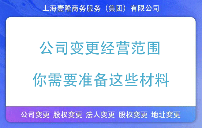 綜上所述,公司變更經(jīng)營(yíng)范圍需要準(zhǔn)備的材料包括基本申請(qǐng)材料、特定情況下的附加材料以及遵循相應(yīng)的辦理流程。在準(zhǔn)備材料時(shí),務(wù)必確保材料的真實(shí)性和完整性,以便順利完成變更登記手續(xù)。若您對(duì)以上材料還存在疑惑,可以找上海壹隆為您解答各種疑惑,還可以交給上海壹隆代辦,無(wú)需本人到場(chǎng),輕松拿證,歡迎咨詢!